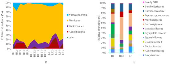 At the family level, the relative abundance of Peptostreptococcaceae, Clostridiaceae 1 and Erysipelotrichaceae was reduced by HFB diet compared to HF diet. Monk et al. [] reported that cranberry bean consumption reduced the relative abundance of Peptostreptococcaceae and Clostridiaceae. Peptostreptococcaceae and Clostridiaceae belong to Firmicutes phylum, Clostridia class. Martinez et al. [] reported the reduction of Erysipelotrichaceae in hypercholesterolemia hamster treated with sorghum extract. Erysipelotrichaceae was reported to be positively correlated with host cholesterol metabolites []. The reduction of plasma LDL, TG levels and relative abundance of Erysipelotrichaceae observed in the present study supports the association between Erysipelotrichaceae and host lipid metabolism. At the genus level, abundance of Blautia, Clostridium sensu stricto 1, intestinal inflammation bacteria Erysipelatoclostridium [], Romboutsia and Turicibacter genera was significantly decreased by HFB diet compared to HF diet, where Blautia was inversely correlated with visceral fat [].