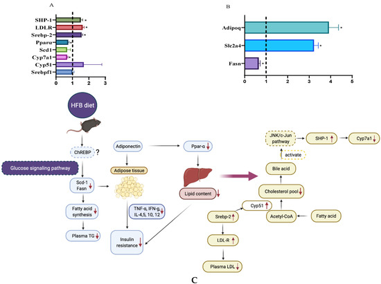 Relative hepatic gene expression of Srebf1, Cyp51, Cyp7a1, Scd1, Ppara, Screbp-2, and LDL-R in mice fed HFQ diet compared to HF diet (A). Relative expression of Fasn, Slc2a4 and Adipoq genes in epididymal adipose tissue of mice fed HFQ diet compared to HF diet (B). Data are expressed as mean ± SEs, and n = 4/group. Differences in mRNA expression for livers and adipose were calculated after normalizing to 35B4 mRNA expression. Asterisk indicates significant difference (p < 0.05). Dotted line (x = 1) represents the expression of control gene. (C) Proposed mechanism responsible for ameliorating insulin resistance in mice fed HF diet supplemented with cooked black turtle beans, glucose signaling pathway, JNK/c-Jun pathway and ChREBP (dashes outline) were extrapolated from literature [,].