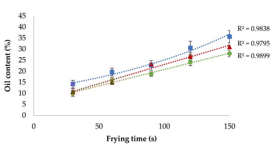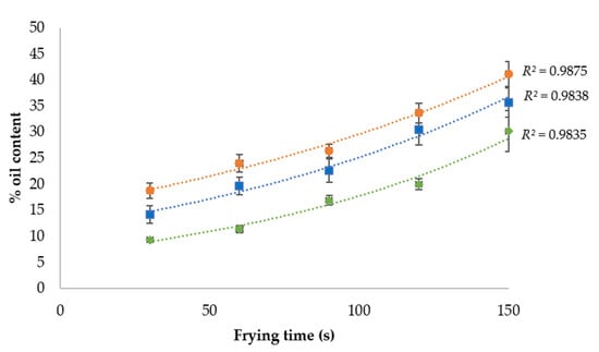 Oil uptake in fried products is influenced by different factors such as oil quality, frying temperature, frying time, pre-treatments, and food composition [7,26]. The mechanism of oil uptake involves heat transfer, surface water evaporation, and the movement of oil droplets into the resulting gaps. Thus, when the water losses during frying are reduced, the oil uptake also decreases [7]. It has also been observed that the final oil pickup is not a direct function of porosity but depends, in an intricate manner, on the amount of oil available at the surface, the connectivity of cells, and the size of path sections [27].