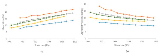 Rheological properties of edible coatings at different temperatures. (a) Flow curve; (b) apparent viscosity curve.
