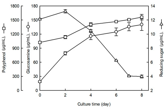 3.1. Changes in Reducing Sugar, Glucosamine, and Polyphenol Contents in a Submerged Culture of C. sinensis with SCG Using an 8 L Fermenter