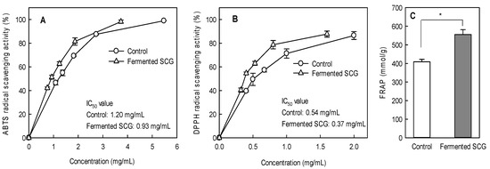 ABTS (A) and DPPH (B) radical scavenging activity and FRAP (C) levels of SCG after 8 days of fermentation. Values are the means ± SD (n = 3). The differences between the unfermented (control) and fermented SCG were evaluated using Student’s t-test (* p < 0.05). The half-maximal inhibitory concentration (IC50) is the effective concentration at which 50% of the ABTS or DPPH radical is scavenged.