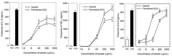 IL-12, TNF-α, and IL-6 production by murine peritoneal macrophages induced by the fermented SCG. Medium was used as the negative control (NC). Lipopolysaccharide (LPS; 5 μg/mL) was used as the positive control. The differences between the unfermented control and fermented SCG were evaluated using Student’s t-test (* p < 0.05).