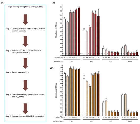 Effect of APTES (0–5%, mL/mL) and blockers on assay NSB using a high-binding microplate. (A) Flowchart of experimental protocol; (B) blockers were dissolved in PBS; (C) blockers were dissolved in PBST. The threshold of the positive absorbance at 450 nm (i.e., A450 = 0.1) is shown in the dashed line. FG: fish gelatin; BSA: bovine serum albumin; CN: casein; NFDM: non-fat dry milk. The data are represented as average ± SEM (standard error of the mean, n = 2). Different letters within the same blocker indicate a significant difference in absorbance (p < 0.05).