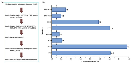 Effect of blockers on assay NSB using a medium-binding microplate. (A) Flowchart of experimental protocol; (B) blockers were dissolved in PBS. The threshold of the positive absorbance at 450 nm (i.e., A450 = 0.1) is shown in the dashed line. FG: fish gelatin; BSA: bovine serum albumin; CN: casein; NFDM: non-fat dry milk; PVP: polyvinylpyrrolidone; PEG: polyethylene glycol. The data are represented as average ± SEM (n = 2). Different letters within the group indicate a significant difference in absorbance (p < 0.05).