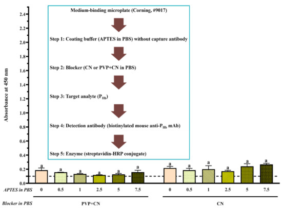 Effect of APTES (0–7.5%, mL/mL) on assay NSB using a medium-binding microplate. The threshold of the positive absorbance at 450 nm (i.e., A450 = 0.1) is shown in the dashed line. CN: casein; PVP: polyvinylpyrrolidone. The data are represented as average ± SEM (n = 2). Different letters within the group indicate a significant difference in absorbance (p < 0.05).
