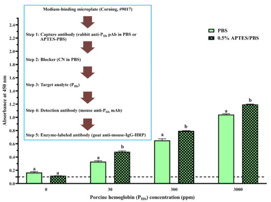 Effect of APTES on the assay immunosignal. The threshold of the positive absorbance at 450 nm (i.e., A450 = 0.1) is shown in the dashed line. The data are represented as average ± SEM (n = 2). Different letters within the group indicate a significant difference in absorbance (p < 0.05).