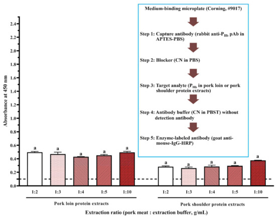 Briefly, coating buffer without or with capture antibody (3 ppm of mouse anti-PHb mAb or 1:1000 (mL/mL) diluted rabbit anti-PHb pAb) was added to the high-binding or medium-binding microplate. After blocking using the selected blockers (Table 2), either PHb dissolved in the extraction solution (0–3000 ppm) or porcine meat extracts were added. To study the effect of blockers (Figure 2A and Figure 3A) and APTES (Figure 2A and Figure 4) on NSB, each well was added with the detection antibody (1 ppm of biotinylated mouse anti-PHb mAb) followed by the streptavidin-HRP conjugate (1:1000 (µL/µL) diluted in PBST). To study the effect of APTES on sELISA immunosignal (Figure 5), unlabeled detection antibody (3 ppm of mouse anti-PHb mAb) followed by goat anti-mouse-IgG-HRP (2.8 ppm) were added. To study the cross-reaction among the capture antibody (mouse anti-PHb mAb or rabbit anti-PHb pAb), porcine meat extracts, or enzyme-labeled secondary antibody (Table 3 and Figure 6), either goat anti-rabbit-IgG-HRP (3.4 ppm) or goat anti-mouse-IgG-HRP (2.8 ppm) was added. Color development was performed by adding 0.1 mg/mL of TMB substrate (100 µL/well), followed by incubating at 37 °C in the dark for at least 5 min. The color was stopped by adding 2 M sulfuric acid (25 µL/well), and the absorbance was measured at 450 nm (A450) using a microplate reader (BioTek Instruments, Inc., Winooski, VT, USA).