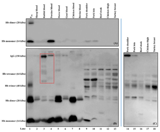 Selectivity of biotinylated mouse anti-PHb mAb (A) and rabbit anti-PHb pAb (B) and cross-reaction between goat anti-mouse-IgG-HRP and meat proteins (C). The protein loading mass of each sample was 5 µg/lane except for PHb (1 µg/lane). IgGs in rabbit and porcine bloods reacting with enzyme-labeled secondary antibody (goat anti-rabbit-IgG-HRP) are indicated using a red dashed box (refer to Figure 8A).