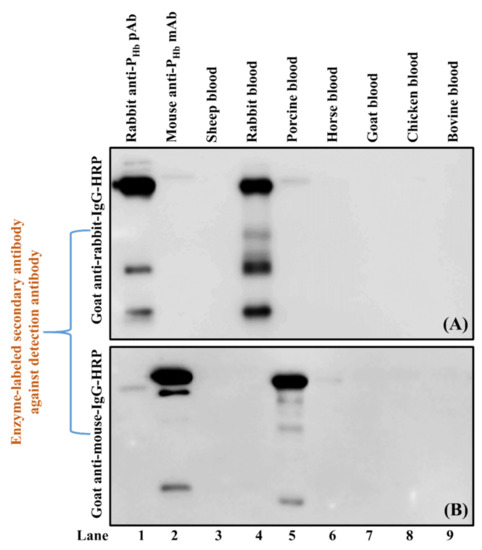 Two cross-reactions, i.e., between rabbit anti-PHb pAb IgG and goat anti-mouse-IgG-HRP (Experiment 4, Table 3) and between mouse anti-PHb mAb IgG and goat anti-rabbit-IgG-HRP (Experiment 5, Table 3), were verified using Western blot by including rabbit anti-PHb pAb IgG (lane 1, Figure 8A) and mouse anti-PHb mAb IgG (lane 2, Figure 8B) as positive controls. Our results confirmed that goat anti-rabbit-IgG-HRP could weakly cross-react with mouse and porcine IgGs (lanes 2 and 5, Figure 8A), while goat anti-mouse-IgG-HRP could falsely immunodetect IgGs from rabbit, porcine, and horse (lanes 1, 5 and 6, Figure 8B).