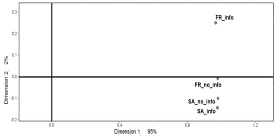 A global analysis was first carried out to compare the four conditions (French without information, French with information, SA without information and SA with information). Individual distance matrices were summed for each condition. The four resulting distance matrices were submitted to a 3-way multidimensional scaling analysis (Distatis, []). This analysis gives rise to a RV map representing the relative distances between the original matrices (RV coefficients are multivariate generalization of the squared Pearson correlation coefficient). It was used to compare the sorts obtained in the four conditions. The closer the conditions on the map the more similar the sorts performed by the participants.
