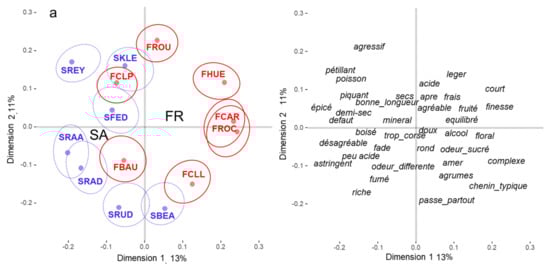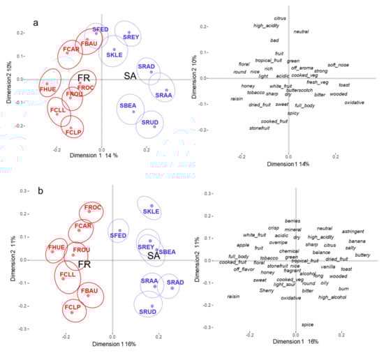 To have a better understanding of the effect of information on French and SA participants, the analysis was separated by conditions. Figure 2a,b represent the compromise maps obtained from the SA sorting data without and with information, respectively. The structure of the compromise space is quite similar in the SA conditions without and with information. In both conditions, the first dimension clearly opposes the SA and French wines (r = 0.95, p < 0.001). A one-way analysis of variance showed a significant effect of wine origin on the projection of the wines on the first dimension. This effect is slightly more important in the with information condition [F(1,12, = 99.76, p < 0.0001, R2 = 0.90], than in the without information [F(1,12) = 39.43, p < 0.0001, R2 = 0.77]. The projection of the wine descriptions shows that this first dimension is a sensory dimension opposing woody and vegetal wines (mostly SA wines) to fruity and floral wines (Mostly French wines).