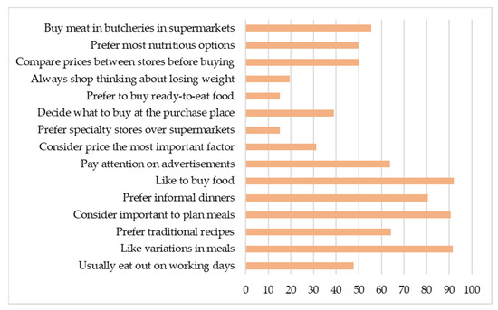 As for men who do not consume lamb meat, 25.1% do not like it, 13.6% have never tried it, 17.9% consider it difficult to find, and 5.1% do not know how or find it difficult to prepare. The other answers were related to factors such as lack of family habit, price, disgust, health issues, low availability of this type of product, and concern for animal welfare but in irrelevant proportions. For both genders, the main reason for not consuming lamb meat is not enjoying it, and this is a group of individuals that the industry cannot easily reach to increase consumption. The other most frequent reasons indicated by respondents do not coincide with what has been found in other studies, which address factors more related to the reduction of red meat consumption in general, mainly related to health issues [26,34].