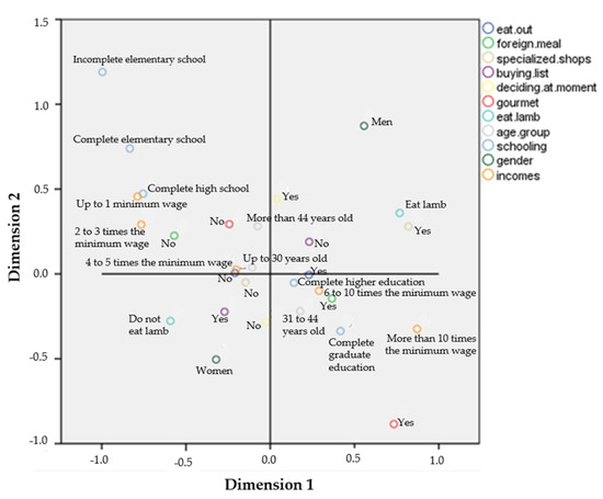 The finding that women are associated with lower lamb meat consumption is recurrent [14,32,33], but CATPCA (Figure 4) indicated that gender has less influence than age, income, and schooling on behaviors presented by these individuals.