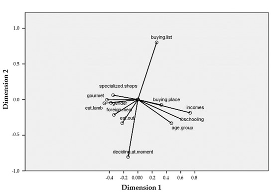 Nonlinear canonical relationship analysis (Figure 3) indicated the three lowest income groups (up to five times the minimum wage) and the least educated people (completed high school at most) are those who do not have the habit of buying meat at specialized stores, do not usually choose gourmet options, and are not so interested in foreign food. In the opposite quadrant, the two highest income levels (from six times the minimum wage) and schooling levels (people with at least higher education) are more interested in gourmet options and foreign food. Among lamb meat consumers, those of higher social class consume more lamb meat and care more about marbling and cutting criteria, while for the group with income of up to three times the minimum wage, these criteria are of little importance. Younger consumers, up to 30 years old, care more about price, which is of little importance for older consumers and those with higher income. Regarding gender, men eat more lamb meat and generally decides what to buy at the time of purchase, while women are more used to using shopping list.