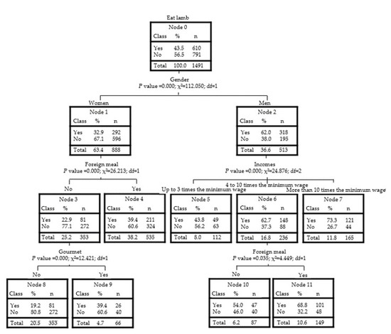 Decision tree of lamb meat consumption groups (growth method: exhaustive CHAID; dependent variable: lamb meat consumers).
