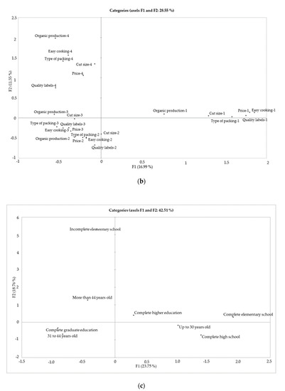 It is known that the segmentation of consumers based on their behavior in relation to food is significant for the formulation of marketing strategies for specific products because it informs the consumer’s particular choices [9]; therefore, multiple factor analysis (MFA) was performed for food purchase and consumption habits (Figure 6a), for quality criteria (Figure 6b), and for sociodemographic variables (Figure 6c).