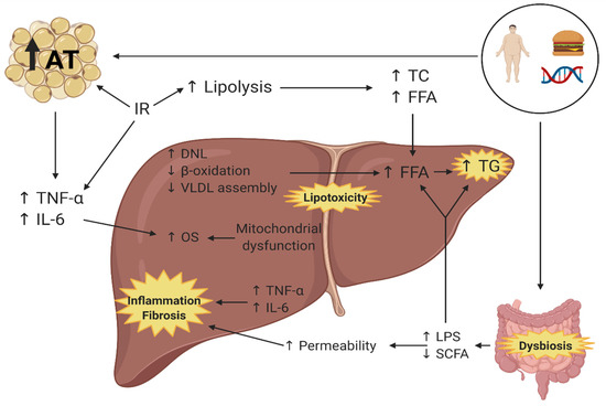 The pathophysiology of NAFLD is related to multiple simultaneous factors (theory of multiple impact), such as the genetic background, the environmental conditions and diet, generating insulin resistance (IR), dysfunction of the adipose tissue, obesity, and changes in the gut microbiota [9,10]. These factors produce a disbalance in the acquisition and elimination of hepatic lipids through increased lipolysis and lipogenesis, rising the circulating concentration and uptake of free fatty acids (FFA). This increases the production of pro-inflammatory cytokines and decreases beta-oxidation and the assembly and release of very low-density lipoproteins (VLDL) to circulation [10,11]. In addition to the above, during the past years, alterations in the composition of the gut microbiota, called gut dysbiosis, have been associated with the development of NAFLD. In these patients, it contributes to its physiopathology [12] (Figure 1).