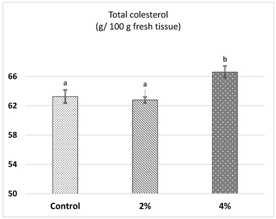 The ANOVA showed a significant effect of the SWA treatments on the total cholesterol content (p ≤ 0.05). Figure 1 shows that meat samples from animals fed with the highest % of SWA (4%) contained 3.37 and 3.81 mg/100 g more muscular tissue cholesterol content than the control and the 2%-SWA groups, respectively (p ≤ 0.05).