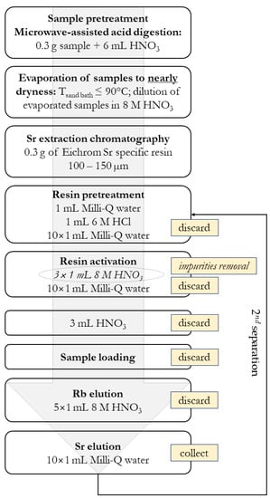 - De Muynck, D.; Huelga-Suarez, G.; Van Heghe, L.; Degryse, P.; Vanhaecke, F. Systematic Evaluation of a Strontium-Specific Extraction Chromatographic Resin for Obtaining a Purified Sr Fraction with Quantitative Recovery from Complex and Ca-Rich Matrices. J. Anal. At. Spectrom. 2009, 24, 1498. [Google Scholar] [CrossRef] [Green Version]