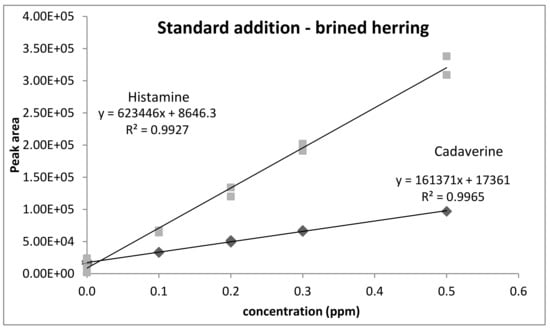 Figure 2 shows the results for HIS and CAD determined by the standard addition technique. Note that concentration on the x-axis is concentration in the solution, therefore the concentration in fish was 10 times higher. Excellent linearity was observed with the standard addition technique. The method sensitivity was the same as for pure standards, so we can state that no matrix effect could be observed. The daily linear calibration curve using pure standards was therefore used for the evaluation of BA concentrations in the real samples.