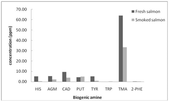 In Figure 3, the concentrations of BAs in fresh and smoked salmon are shown. It can be seen that in general, the concentrations of BAs in smoked salmon were lower than in fresh salmon samples. Both samples had the highest content of trimethylamine and the lowest content of TRP and PHE, whereas the contents of other BAs were comparable.