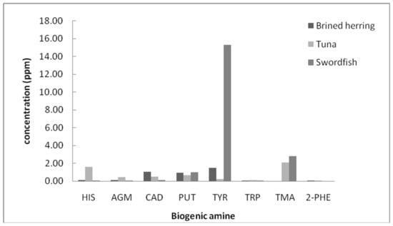 The interest in the determination of biogenic amines (BAs) in fresh and processed foods is growing not only due to their toxicity, but also due to the levels of BAs in food products often being considered as a marker of spoilage during storage or ripening, and therefore, a quality index [1,2]. The consumption of foods containing high concentrations of BAs may cause some adverse effects to some consumers, such as headache, hypo- or hypertension, nausea, cardiac palpitation, renal intoxication, and in severe cases, intracerebral hemorrhage and death [3,4]. The formation of BAs in food depends mainly on the microbial decarboxylation of available free amino acids in the product. Therefore, the amount of BAs in the products varies and is closely related to the types of available free amino acids, the presence of BA forming bacteria, and the conditions for microbial activity such as suitable time/temperature, pH, and water activity. The most frequent kind of food intoxication relating to BAs is histamine poisoning, previously known as “scombroid fish poisoning” due to its first involvement being reported from Scombridae family such as tuna. The secondary amines such as putrescine (PUT) and cadaverine (CAD) also play an important role in food poisoning, as they can increase the toxicity of histamine (HIS) or react with nitrites to form carcinogenic nitrosamines.