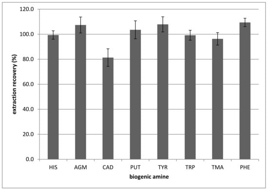 Extraction recoveries for some biogenic amines using the extraction method described in Section 2. HIS: Histamine, AGM: Agmatine, CAD: Cadaverine, PUT: Putrescine, TYR: Tyramine, TRP: Tryptamine, TMA: Trimethylamine, 2-PHE: 2-phenylethylamine.