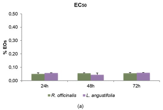 Bar graphs of EC50 values obtained by thiazolyl blue tetrazolium bromide assay (MTT) after 24, 48 and 72 h of SHSY5Y cell treatments, (a) with R. officinalis and L. angustifolia EOs and (b) with the corresponding Hys. Error bars: standard deviation.