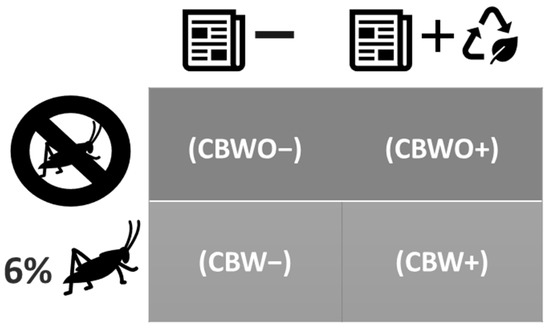 Qualtrics software (Qualtrics, Provo, UT, USA) was used to administer the computer-based questionnaires given to panelists and to collect their responses. The four CB treatments (Figure 1) were presented together before starting the evaluation. Then, consumers were instructed to evaluate them in a monadic-sequential order as indicated on the screen based on the three-digit sample blinding code, and specific sample information and related benefits of ECP were given for each sample. The full related benefits of ECP statement was as followed “This sample contains ECP. Edible insects are safe to eat and are considered a sustainable source of high-quality protein and other nutrients. Edible insect production has less negative environmental impact than traditional livestock production. An estimated two billion people worldwide consume edible insects” [26].