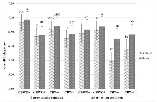 Treatments overall liking (OL) bar chart segmented by tasting condition (before vs. after tasting). Data are OL least square means and standard errors from n = 112 female and n = 98 male groups. Treatments are described in Figure 1. Different uppercase/lowercase letters indicate significantly (p < 0.05) different before tasting/after tasting OL scores (Tukey’s means separation) across treatments and gender. * Denotes significantly (p < 0.05) lower after-tasting OL score than its corresponding before-tasting OL score (Tukey’s means separation).