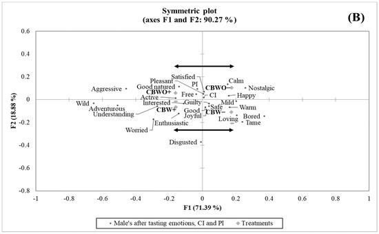 Contrary to the before-tasting condition, the proportion of discriminant after-tasting emotion terms for the female group (9/25) was not significantly different (p > 0.05) from that of the male group (4/25). Table 4 shows the effect of formulation and disclosed information on the treatments’ emotional profile in the after-tasting condition by gender. For the female group, the “adventurous” and “interested” emotions were positively affected by the ECP+ disclosed information in both formulations, and the “bored” emotion was less frequent for CBWO+ than for CBWO−.