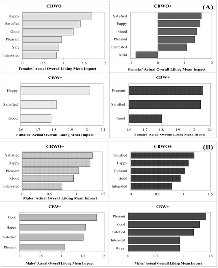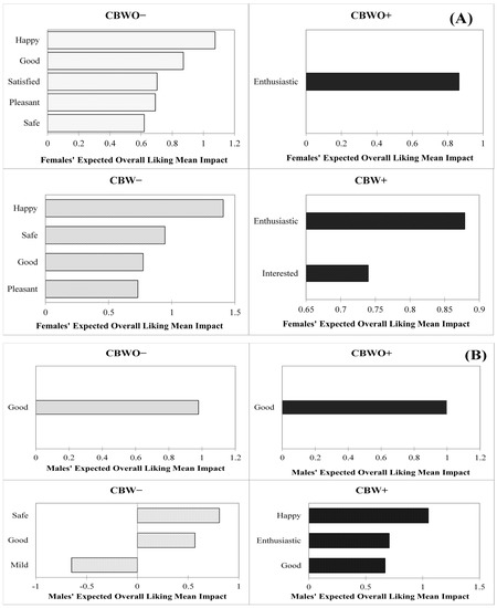 Figure 6A,B illustrate elicited emotions in the after-tasting condition from the female and male groups that significantly (p < 0.05) affected treatments’ actual OL, respectively. Among the female group, the actual OL presented similar significant emotion terms across formulations for either disclosed information but for CBW treatments, fewer critical emotion terms affected the actual OL. When comparing across disclosed information, the “safe” and “mild” low activation/arousal emotions positively and negatively affected CBWO− and CBWO+ actual OL, respectively, while “happy” and “pleasant” positively affected CBW− and CBW+ actual OL for the female group, respectively. CBWO+ “mild” sensation reduced its actual OL possibly because female participants expected extravagant flavors or aroma from ECP, which were disconfirmed upon tasting. However, the disconfirmation experienced for CBW− did not elicit emotions that significantly inhibited its actual OL (considering a 20% selection threshold to evaluate significance). Although CBW− and CBW+ presented the lowest actual OL (5.46 and 5.90, respectively) within the female group (Figure 2) none of the after-tasting elicited emotions were significant inhibitors for it; on the contrary, the significant drivers for CBW− and CBW+ actual OL were all positive emotions in the valence continuum [87]. Product liking sometimes does not correlate well with emotions; products exhibiting low OL may elicit positive emotions and vice versa [80,83]. Nevertheless, liking and emotions together can better explain consumption behavior and food choices [76,88].