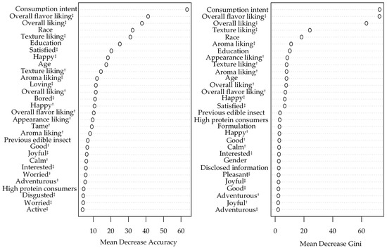 Random forest classifier variables importance plots for purchase intent (PI) prediction. † Before-tasting condition; ‡ after-tasting condition.