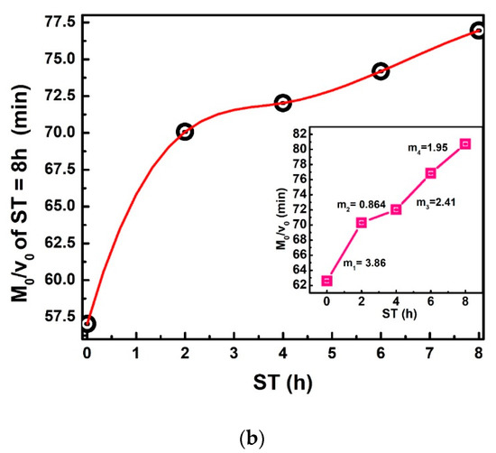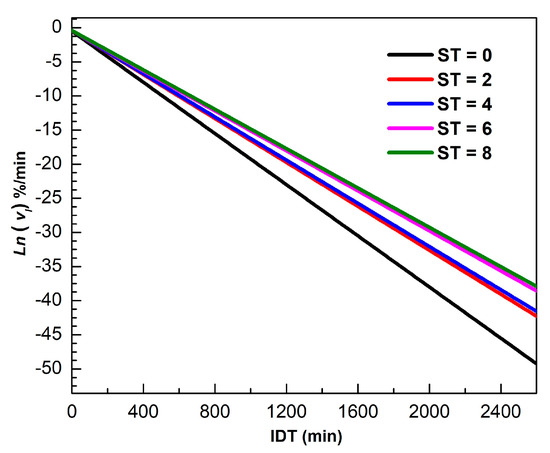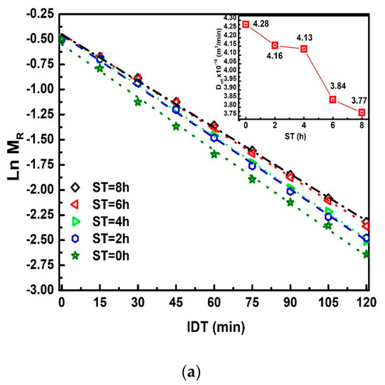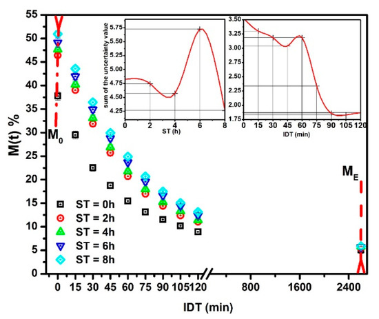 The experimental versus IDT data (points) for ST = 0, 2, 4, 6 and 8 h are depicted in Figure 1. The reproducibility (R2) of fitting has a determination value in the 0.994 ≤ R2 ≤ 0.999 interval. These R2 values establish the Equation (9) validation to predict the NCG dehydration kinetics as a function of ST. That is, the predicted results will have an uncertainty within the ±0.181–±0.993 interval. All the versus IDT curves display a similar aspect. The sample with ST = 0, with only cooked alkaline water (black squares), shows a significant difference as compared with others for ST ≠ 0. The initial moisture is lower for ST = 0 because, with only cooking time, the water absorbed is less. When ST increases, increases significantly [22,23]. vs. IDT results show similar curves to those reported by [24,25]. The insets in Figure 1 indicate that higher ST and IDT, uncertain values tend to stabilize in lower values. As a consequence, if the ST-IDT couple of data increases, the measurement reproducibility improves. Nevertheless, in general, the tendency to increase is from high to low IDT values. The importance of this statistical experimental information is that the uncertain values are small; thus, each experimental datum is satisfactory, followed by the mathematical model.
