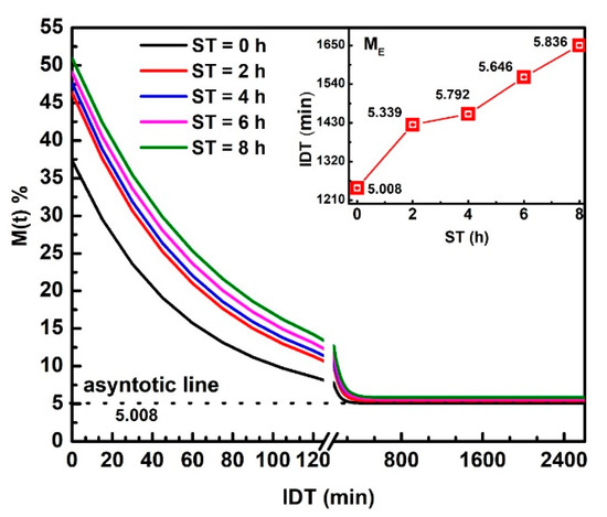 Figure 2 displays versus IDT curves fitting in the 0 ≤ IDT≤ 2600 min intervals of time. represents the moisture data within the range from up to .The three , , and , parameters were obtained from the fitting. The inset plots IDT vs. ST; numbers above each point indicate IDT to reach for every ST [25]. Notice how IDT to obtain increases as ST rises. The IDT versus ST data tendency does not follow smooth increases. The non-smooth, gradual variation of data along a smooth line is not due to errors since they are contained within the size of plotted points. The ST increases have a significant effect on , which influences the corn masa performance after the NCG milling in a stone mill, affecting the tortillas as a final product. Observe that the moisture tends to be an asymptotic value when IDT tends to infinite. is the new endogenous moisture limit in all samples, which is similar for all ST and is represented by an asymptotic value in versus IDT curve.