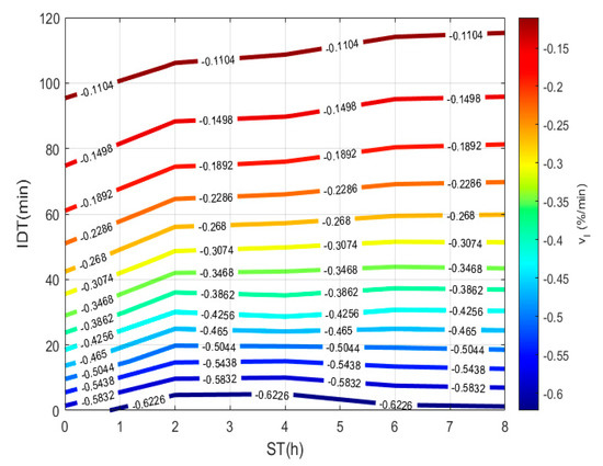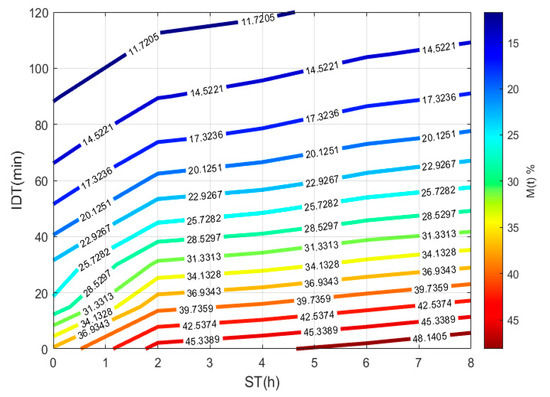 To plot Figure 5, a 3D matrix-graph with contour(X,Y,Z,n) is used to obtain dehydration rate isolines, where x = ST, y = IDT, Z == constant rate and n = 14. From data obtained from Equation (11) and listed in Table 1, the rate, in the 0 to 8 h interval, for any ST experimental point can reproduce, and in intermediate points predicted in the 0 to 120 min range. A negative sign physically represents the hydration percentage lost during the NCG dehydration process. The , which shows a continuous representation during the dehydration process, depends on ST that can be conveniently applied to loss of moisture when being cooked. Thus, corn performance rises to increase the quality of the tortilla.