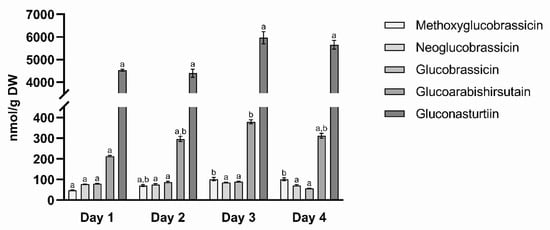| 4-Methoxyglucobrassicin | 46.8 ± 2.1 a | 70.6 ± 5.0 a,b | 101.3 ± 8.3 b | 101.5 ± 6.3 b |