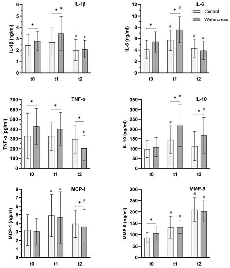 | IL-1β (ng/mL) | 2.40 ± 0.98 * | 2.66 ± 1.26 * | 1.98 ± 0.90 # | 2.77 ± 0.82 * | 3.47 ± 1.45 *,# | 2.06 ± 0.75 # |