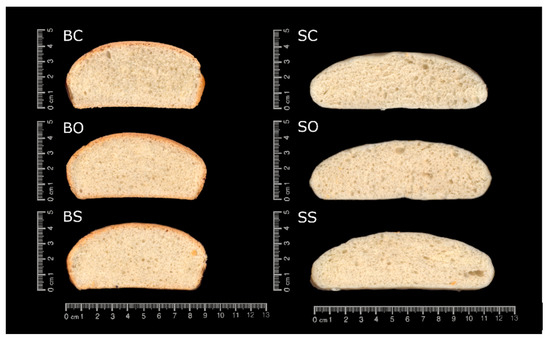 Cross section of breads. Baked control bun made with margarine (BC); baked bun made with olive oleogel (BO); baked bun made with sunflower oleogel (BS); steamed control bun made with margarine (SC); steamed bun made with olive oleogel (SO); steamed bun made with sunflower oleogel (SS).