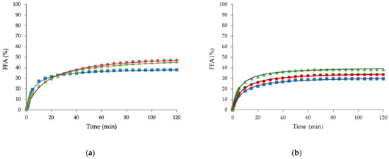The experimental data of FFA released were fitted with the empirical model following Equation (2) [27]: