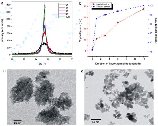 Structural and morphological properties of PF-co-doped TiO2 nanoparticles: X-ray diffractograms (a); crystallite size and anatase content of PF-TiO2 nanoparticles (b); representative TEM images of PF-TiO2/0 h and PF-TiO2/12 h samples (c,d).