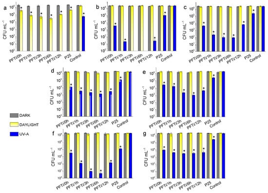 Antibacterial activities of the hydrothermally prepared PF-co-doped TiO2 nanoparticles on the foodborne pathogenic bacteria Campylobacter jejuni (a), Salmonella Typhimurium (b), Enterohaemorrhagic E. coli (c), Yersinia enterocolitica (d), Shewanella putrefaciens (e), Listeria monocytogenes (f) and Staphylococcus aureus (g). Experiments were performed under dark conditions or daylight or UVA exposures for 30 min. Starting CFUs were ~106 CFU mL−1. The concentration of PF-TiO2 NPs was 500 μg/mL. Lack of the blue column demonstrated the complete elimination of the treated bacteria. * Significant difference at p < 0.05.