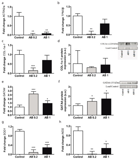 ACTIN-2α levels were reduced after treatment with 0.2 and 1 mg/mL AB extract (p ≤ 0.01, Figure 1a) compared with those in control cells. TPM2β and COL1α1 gene expression levels were reduced when LX2 cells were treated with 0.2 mg/mL AB extract (p ≤ 0.01, Figure 1b; p ≤ 0.001, Figure 1c, respectively), while no significant differences were found in response to 1 mg/mL compared to those in control cells. No significant changes were observed in the abundance of COL1α1 protein relative to that in control cells after exposure to both AB extract concentrations (Figure 1d). GATA4 gene expression was significantly increased by 0.2 mg/mL (p ≤ 0.001) and 1 mg/mL (p ≤ 0.05) AB extract (Figure 1e) relative to that of control cells. The protein expression of GATA4 was significantly increased in the presence of different concentrations of AB extract (p ≤ 0.05, Figure 1f). Entire Western blots are shown in Figures S2 and S3.