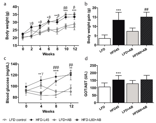 BW and biochemical blood parameters of LDLR-/- mice during 12 weeks of nutritional intervention with AB extract. (a) Changes in BW during the 12-week period. (b) BW gain at 12 weeks. (c) Glycaemia during the 12-week period. (d) Final GOT/AST levels. All data are shown as the means ± SD (n = 5). * p ≤ 0.05/** p ≤ 0.01/*** p ≤ 0.001 HFD45 vs. LFD; β p ≤ 0.05/ββ p ≤ 0.01/βββ p ≤ 0.001 HFD45 vs. LFD+AB; γ p ≤ 0.05 HFD45 vs. HFD60+AB; ## p ≤ 0.01 LFD+AB vs. HFD60+AB. The interaction of diet and time, with respect to body weight and glycemia, was analyzed by a two-way ANOVA.