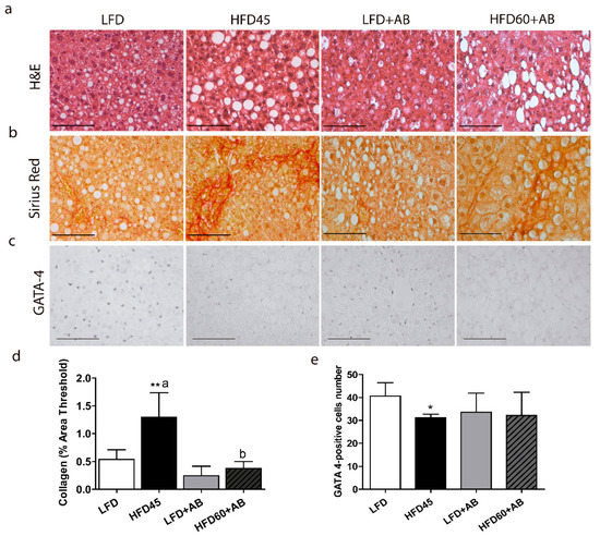H&E and Sirius Red staining showed the degree of injury to the liver (Figure 3a,b). In addition, liver GATA4-positive cells were also analyzed (Figure 3c). The HFD45 control group exhibited significant increases in fibrosis and a large effect size (p ≤ 0.01, d = 2.264, β err = 0.122) compared to those of the other groups. Notably, animals fed HFD60+AB showed the same level of fibrosis as those in the LFD and LFD+AB groups. These values were all significantly reduced (p ≤ 0.05, d = 2.834, β err = 0.026) with a large effect size compared to those of the HFD45 group (Figure 3d). Regarding GATA4, the HFD45 group showed significantly reduced levels compared to LFD with a large effect size (p ≤ 0.01, d = 2.198, β err = 0.017), while AB-treated groups did not differ with respect to LFD and HFD45 groups (Figure 3e).