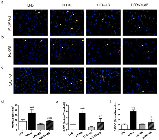 The numbers of MOMA-2- and NLRP3-positive cells were significantly increased in the HFD45 control group compared to those in the other groups (p ≤ 0.01, d = 4.543, β err = 0.001). Notably, the HFD60+AB group had significantly fewer MOMA-2 infiltration (p ≤ 0.01, d = 3.655, β err = 0.008) and NLRP3-positive cells (p ≤ 0.05, d = 2.683, β err = 0.041) than the HFD45 group with a large effect size, despite the higher fat and caloric content of the diet in this group (Figure 4d,e). Finally, HFD45 significantly increased CASP-3 positive cells, compared to LFD (p ≤ 0.01, d = 9.922, β err = 0.000) and HFD60+AB groups (p ≤ 0.01, d = 4.308, β err = 0.001; Figure 4f) with a large effect size, indicating a possible antiapoptotic effect of AB extract despite the HFD intake.
