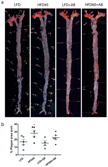 The effects of AB treatment on the development of atherosclerotic plaques were assessed after 12 weeks of HFD feeding (Figure 6a). The atherosclerotic lesions were primarily distributed in the aortic arch. In the HFD45 control group, we detected a significant increase in the lesion area around the arch by 11.3% with a large effect size with respect to that in the LFD control group (p ≤ 0.05, d = 1.353, β err = 0.531).