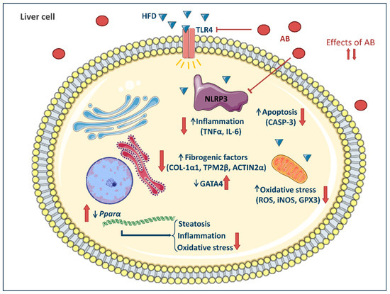 Potential mechanisms of action of AB bioactive compounds on inflammation and oxidative stress processes. The saturated fatty acids of the HFD and/or adipose tissue lipolysis enter the bloodstream and act as ligands of the TLR4 receptor. This binding activates several signaling pathways in liver cells to promote the progression of liver damage. AB extract promotes a decrease in TLR4 activation and oxidative stress production in the cell, which reduces NLRP3 inflammasome activation and apoptotic markers, increases Pparα mRNA expression, and decreases the gene expression of fibrogenic molecules, reducing inflammation, oxidative stress, and fibrosis.