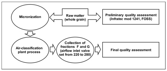 The reduction in particle size obtained through micronization can be followed by an air-classifier treatment in order to obtain two or more fractions that are collected separately. Micronization consists of a milling process able to reduce the starting matrix such as cereal grains in a fine particle product through the use of different technologies (e.g., hammer mill, knife mill). The range of the particle size of the milled product depends on the sieve diameter employed [11]. The general functioning criteria of the air-classification system is based on the pneumatic transportation of the milled particles inside the plant, which operates in depression, thus promoting a pneumatic flow along circular orbits. Inside the orbits, a series of ascending airflows was controlled by setting the airflow inlet valve to different opening conditions. Due to the combined action of different forces, the heavier particles fall in the first “G” housing (heavier gross particles), whereas the lighter particles fail to be collected in the first step but are gathered in the second “F” housing (fine particles). Bran fractions derived from both debranning and micronization were used to enrich semolina, obtaining pasta products with enhanced health properties and minimal impacts on sensory quality [14]. The above technologies are also useful to better manage the natural or chemical contaminants (e.g., mycotoxins, heavy metals, and pesticides) that are typically concentrated in the outermost layers of the wheat kernel [15,16,17].